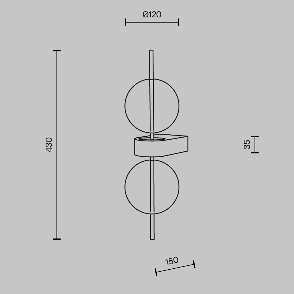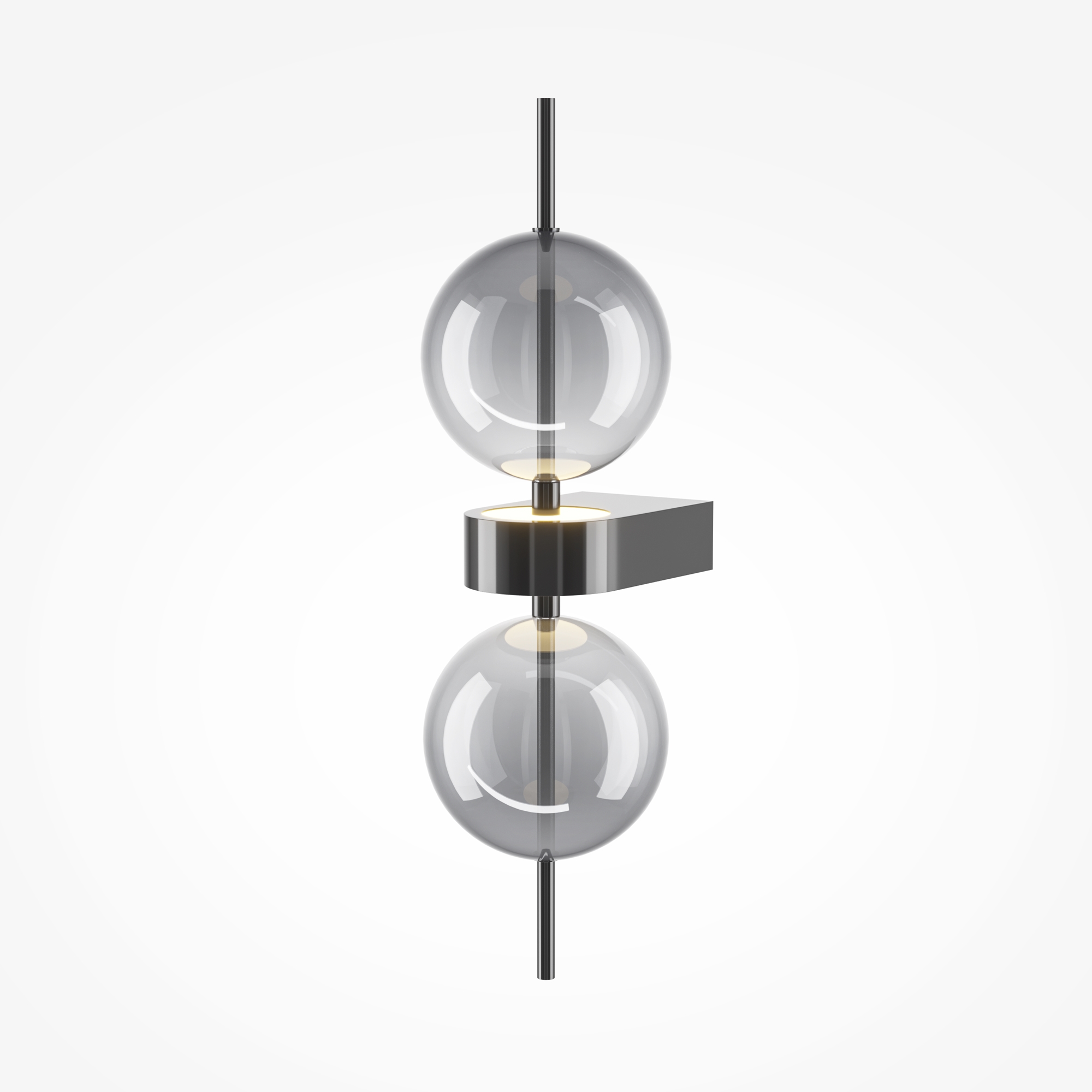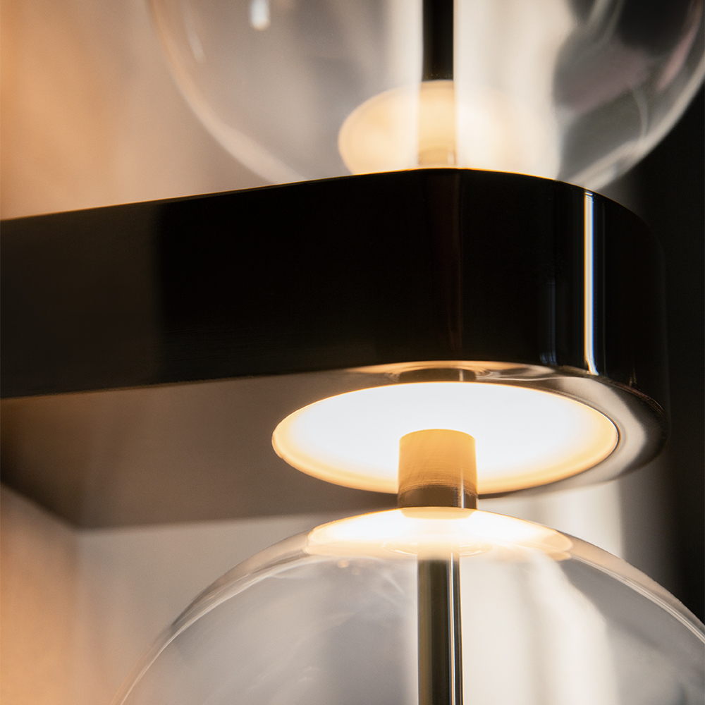 Серия включает подвесной светильник, бра, напольный и портативную модели. Стеклянные плафоны с зеркальным градиентом, черная глянцевая арматура из металла. LED-источник (3000K) скрыт матовым рассеивателем. Конструктивные особенности: магнитные потолочные чаши у подвесов и магнитное основание у бра обеспечивают монтаж без видимого крепежа. Напольный и аккумуляторный светильники диммируются при длительном удержании кнопки. Серия отмечена премиями Red Dot и A’design за инновационный дизайн.