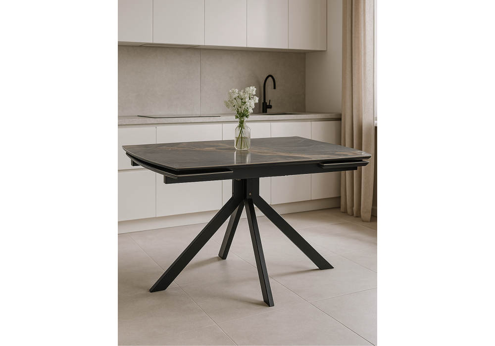 Материал каркаса - металл; Материал столешницы - Керамика; Цвет ножек - черный; Ширина - 80; Высота - 77; Длина стола в разложенном виде - 180; Длина - 120;