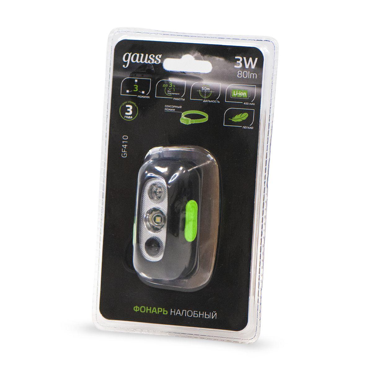 Купить "Налобный светодиодный фонарь Gauss аккумуляторный 65х35 80 лм GF410"