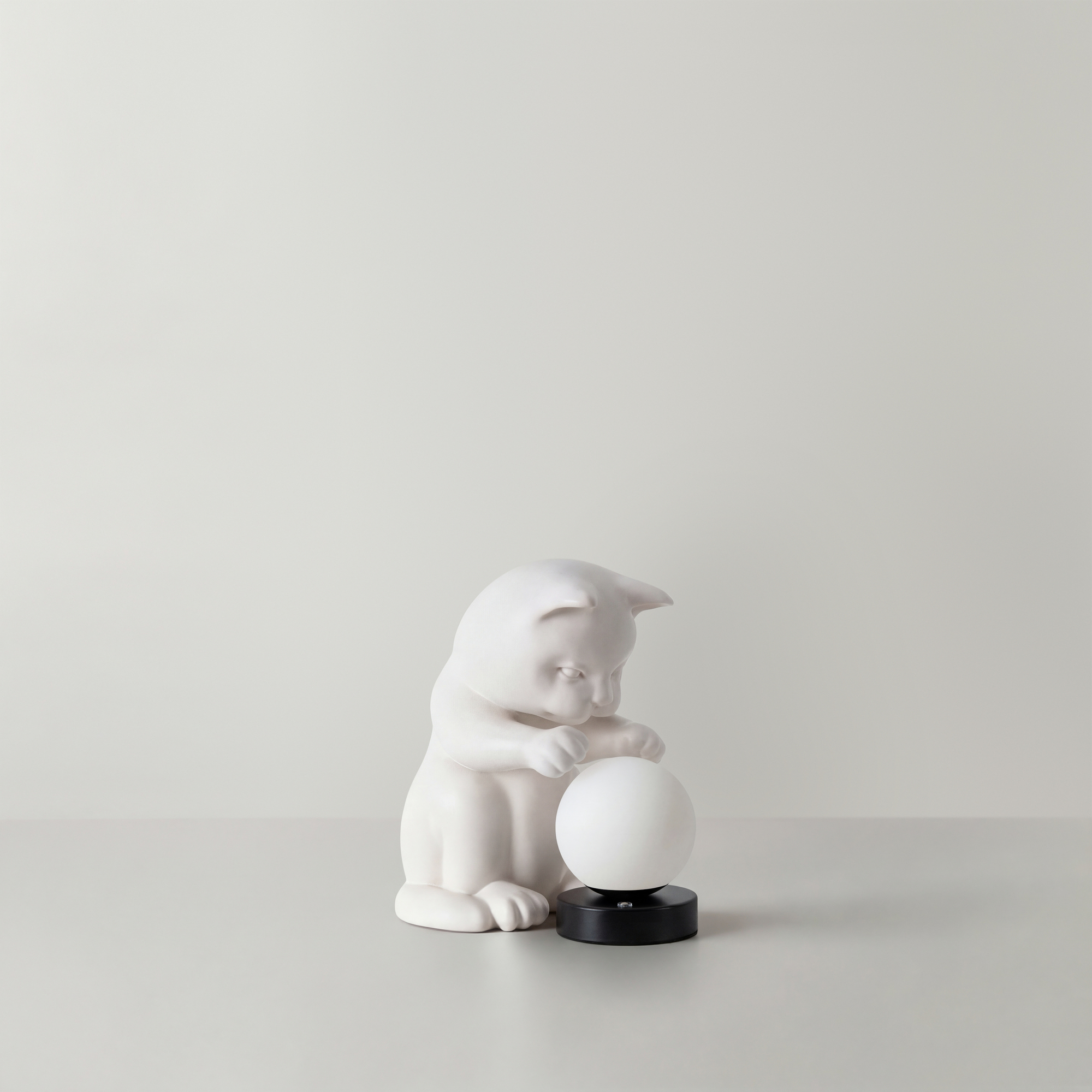 Арматура — полирезин. Абажур из белого матового пластика, форма сферы. Интегрированный LED источник света 3000К. Высота 270 миллиметров. Сенсорное управление. Фигурка котика (RAL 9001) в комплекте.