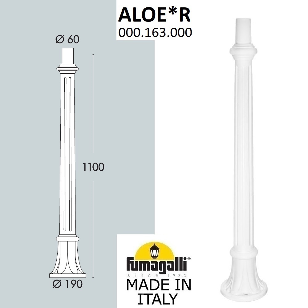Парковый столб FUMAGALLI, модель ALOE. Опора наземная высотой 1100 мм для светильника малого и среднего размера. Посадочный размер для фонарей равен 60мм.. Корпус изготовлен из современного вандалостойкого не горючего полимера RESIN. Прочного, окрашенного в массе, не ржавеющего и не выгорающего на солнце. Ножка и светильники не требуют заземления и относятся к 2 классу электробезопасности. Срок службы - не менее 20 лет. Температура использования от -60 до +90.