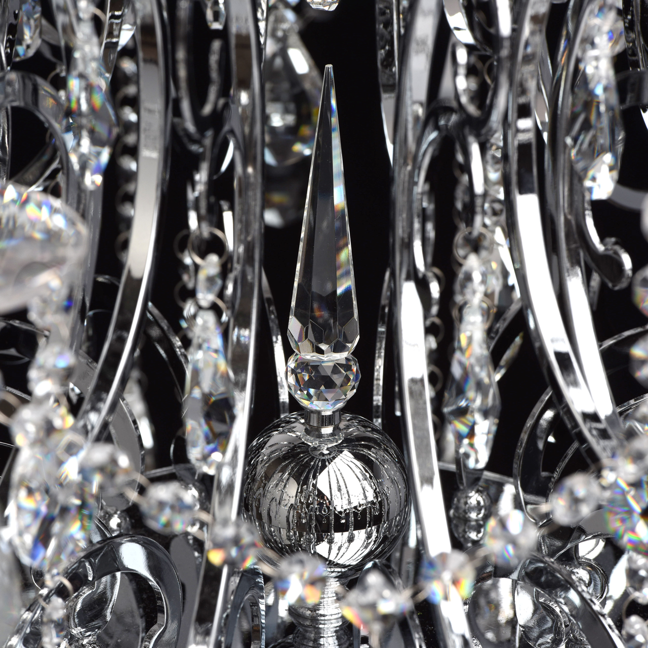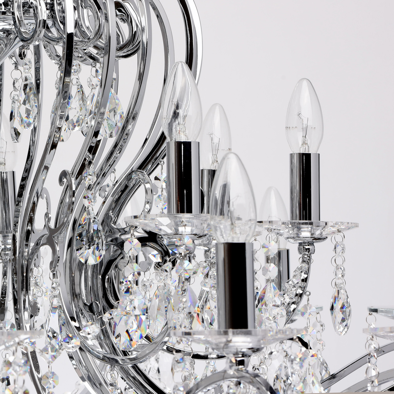 Металлическое основание гальванизировано в цвет хрома. Декоративные розетки выполнены из массива хрусталя ручной калибровки. Светильник декорирован хрусталем в форме миндаля и октагон высокого качества.