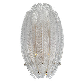 Металлический каркас имеет благородный золотой оттенок, рассеивателем служат несколько рядов полупрозрачных стеклянных текстурных элементов в форме продолговатых листьев. Источником света являются встроенные светодиоды с цветовой температурой 3000К, что соответствует теплому освещению.