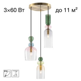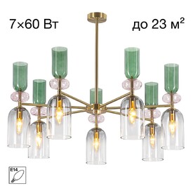 Основание светильника из металлического сплава, стильного оттенка латунь. Изящный плафон и декор — из прозрачного стекла с разноцветной тонировкой: розовой, зеленой и дымчатой. Оригинальное сочетание оттенков создает модный и комфортный свет.
