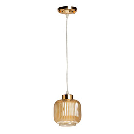Основание подвеса выполнено из металла с имитацией под натуральное дерево светлого цвета. Стеклянный плафон, гальванизирован в цвет шампань с линейным рисунком отлит в форму.