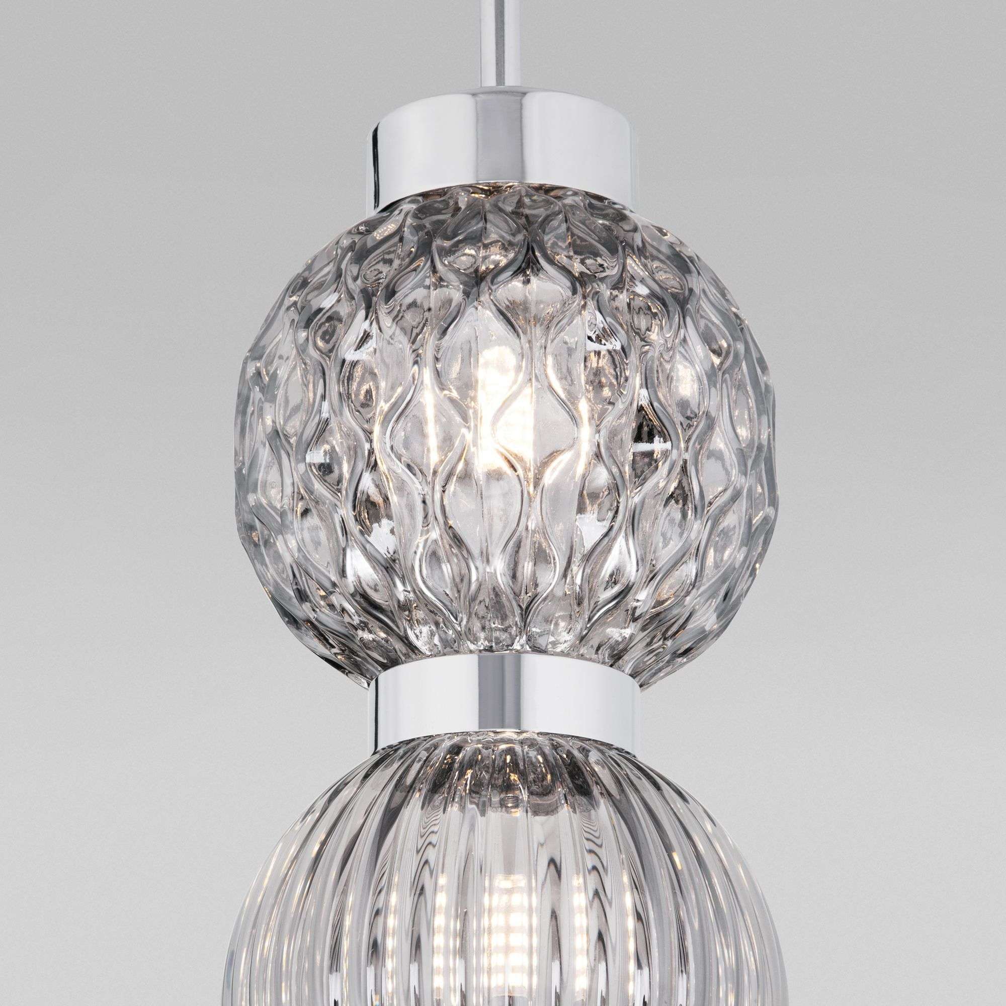 Подвесной светильник со стеклянными плафонами 50186/2 хром серия Plaz предназначен для создания дополнительного освещения и акцентной подсветки в современных интерьерах. Светильник со сменной лампой G9 создаст качественное освещение на площади 1 кв.м. и подсветит рабочие зоны на кухне, в гостиной, в офисе и других местах.