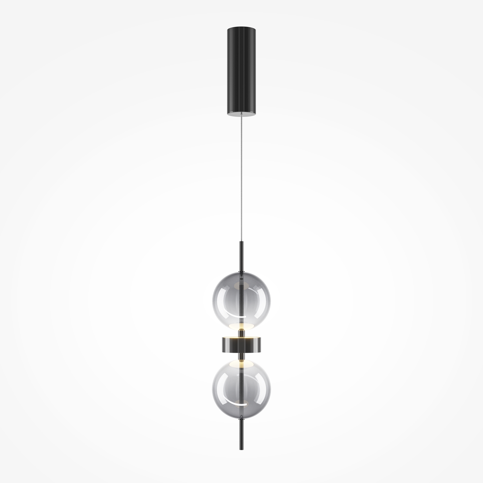Серия включает подвесной светильник, бра, напольный и портативную модели. Стеклянные плафоны с зеркальным градиентом, черная глянцевая арматура из металла. LED-источник (3000K) скрыт матовым рассеивателем. Конструктивные особенности: магнитные потолочные чаши у подвесов и магнитное основание у бра обеспечивают монтаж без видимого крепежа. Напольный и аккумуляторный светильники диммируются при длительном удержании кнопки. Серия отмечена премиями Red Dot и A’design за инновационный дизайн.