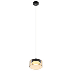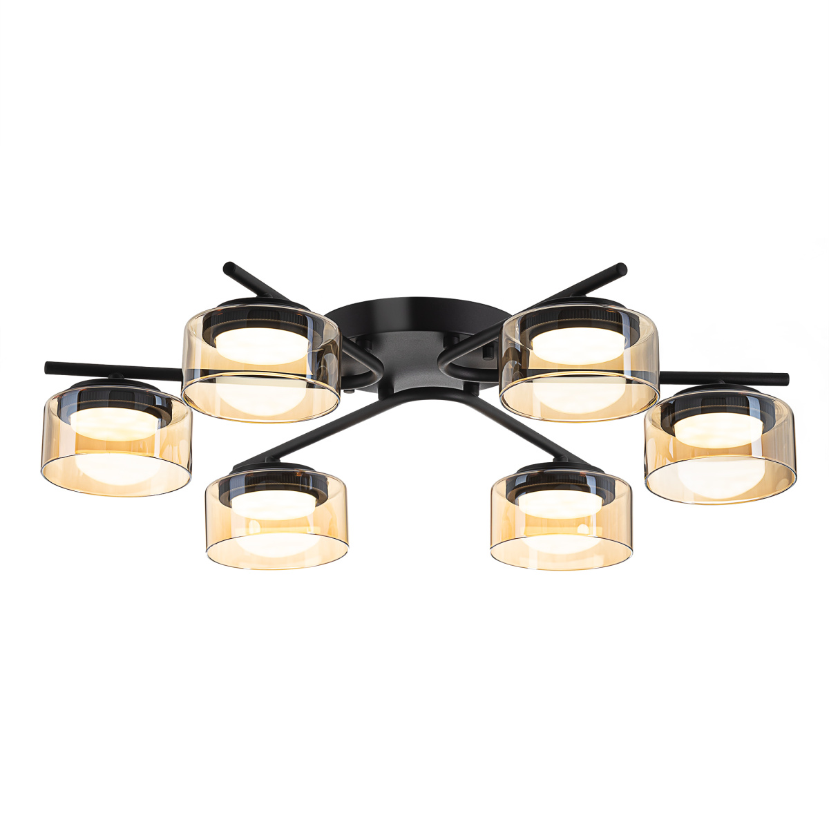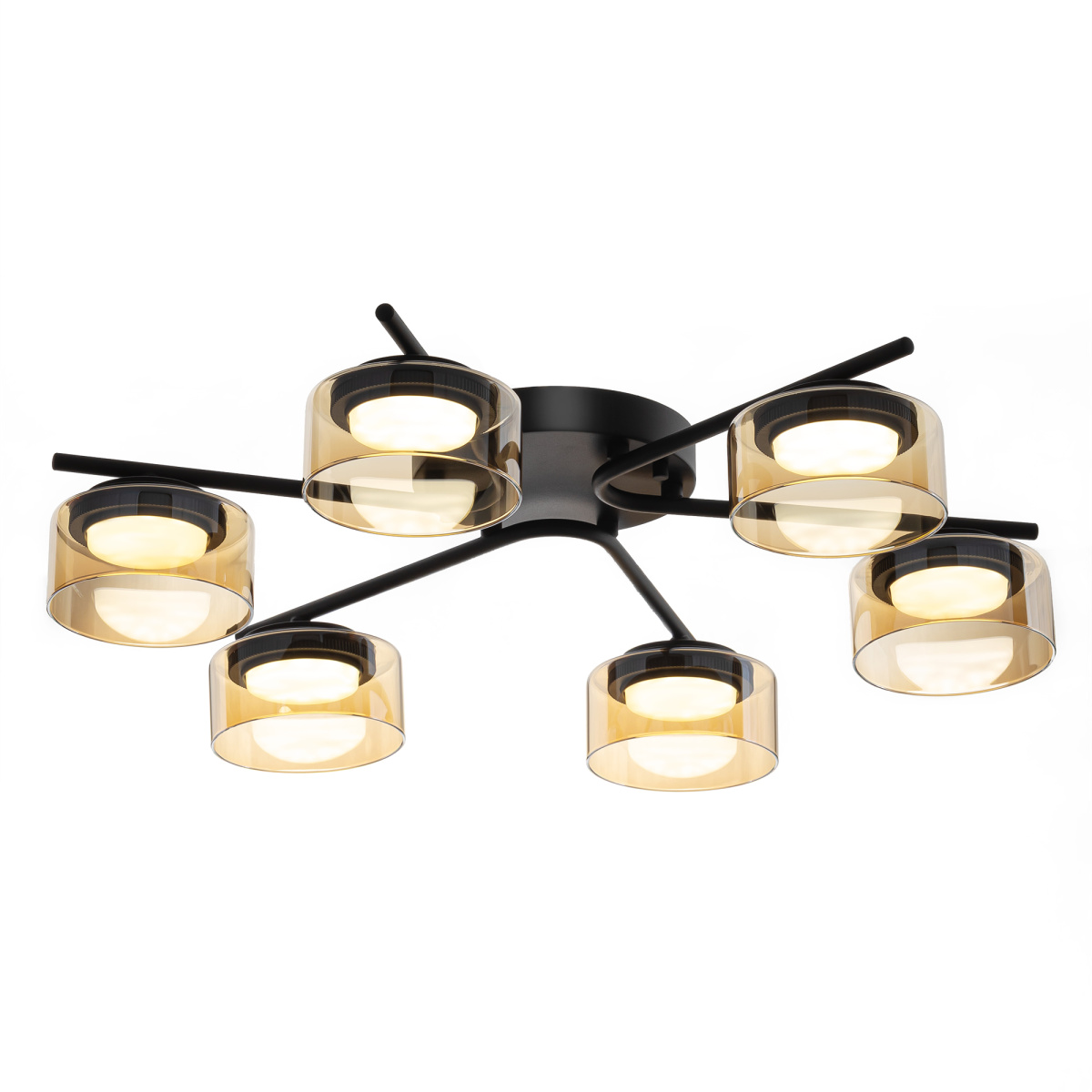 Черный металлический каркас придает люстре сдержанности, а стеклянные открытые плафоны в форме цилиндра с тонировкой оттенка шампань создают игру света и тени, наполняя пространство мягким рассеянным светом. Модель крепится к потолку при помощи планки, в изделии используется шесть LED ламп с цоколем GX53.