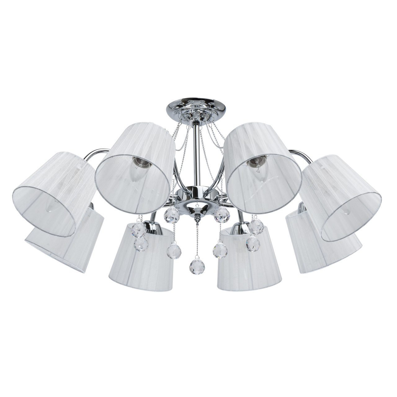 Основание светильника выполнено из сплава металла и гальванизировано в цвет хрома. Абажуры из прозрачной органзы белого цвета с термостойким акрилом внутри. Абажуры отделаны кантом сверху и снизу, прошиты. Светильник декорирован металлическими цепочками в цвет основания и прозрачным хрусталем в форме шара.