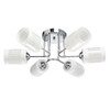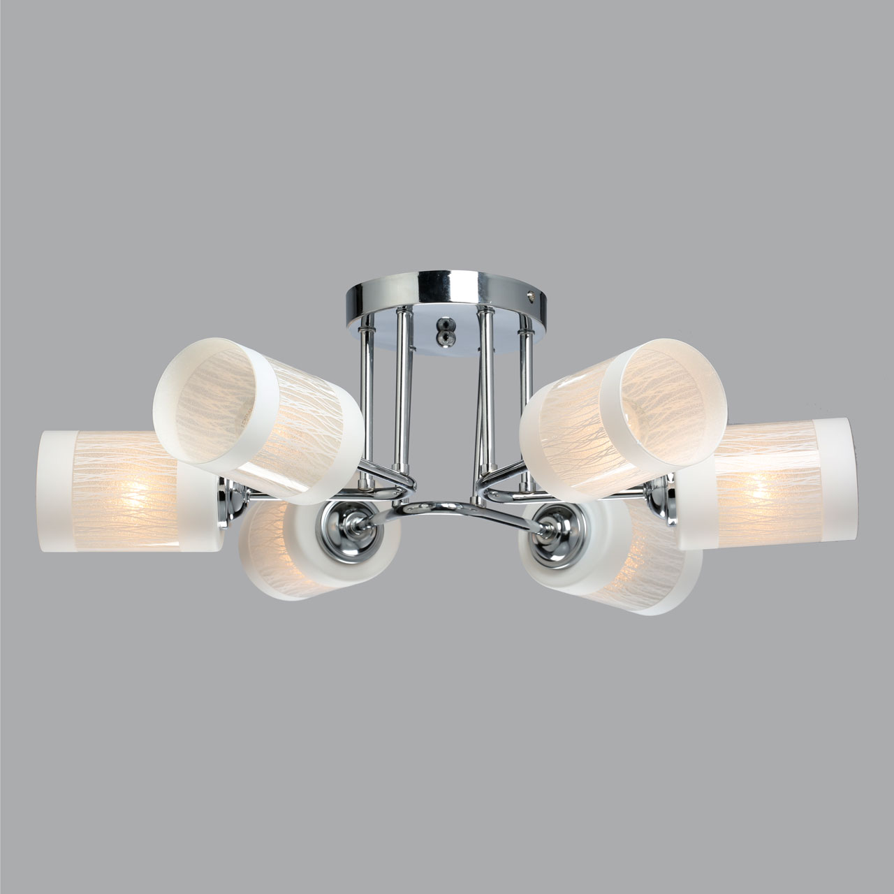 Основание потолочного светильника изготовлено из металла и покрыто хромом. Серебро отлично сочетается с плафонами из белого матового стекла. Оригинальная деталь – рожки, изнутри декорированные стеклянной крошкой, которая отражает свет и рассеивает его, создавая эффект перламутра.