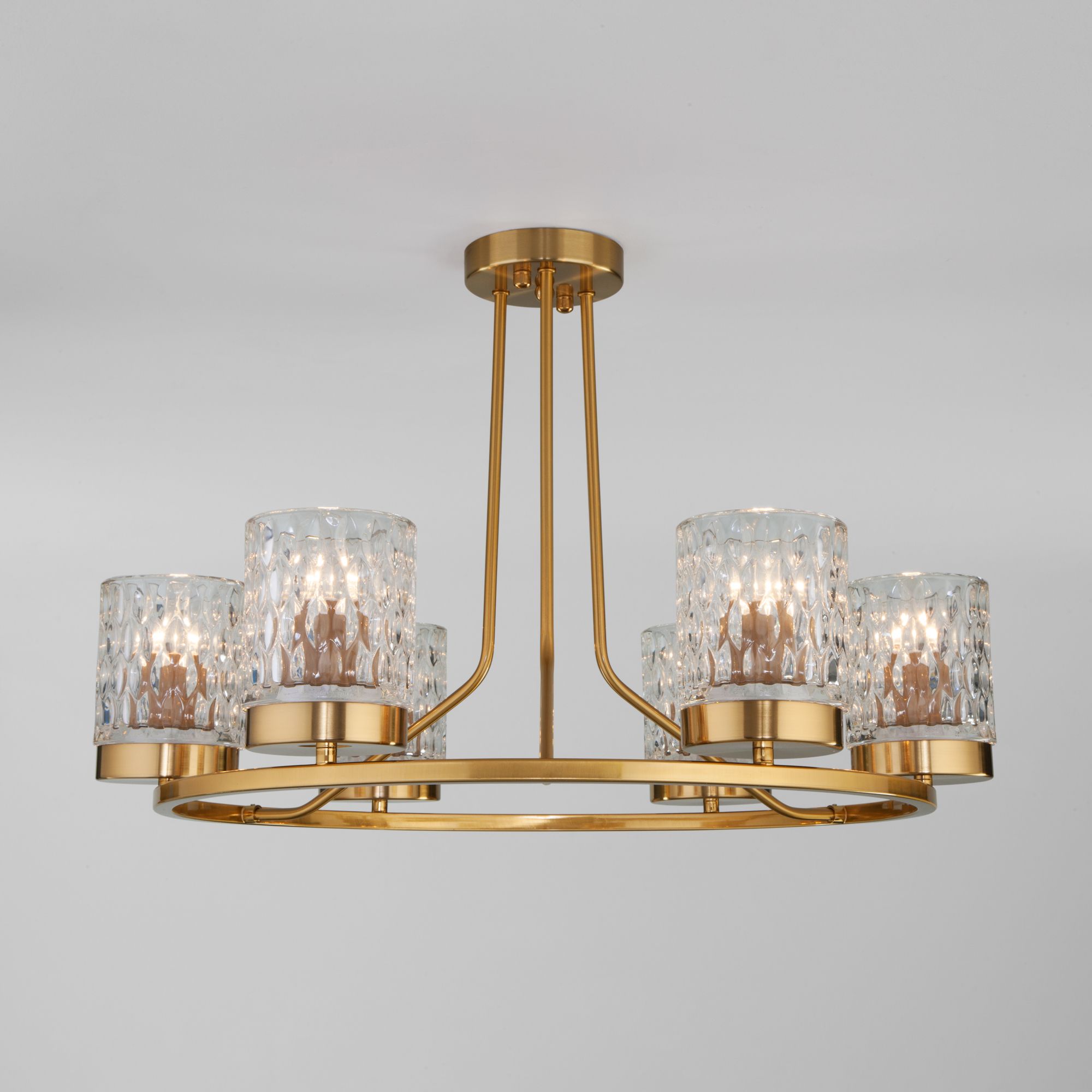 Организовать качественное освещение вам поможет эффектная потолочная люстра со стеклянными плафонами в цвете латунь. Простые эргономичные формы и умеренные тона станут прекрасным дополнением для вашего помещения.