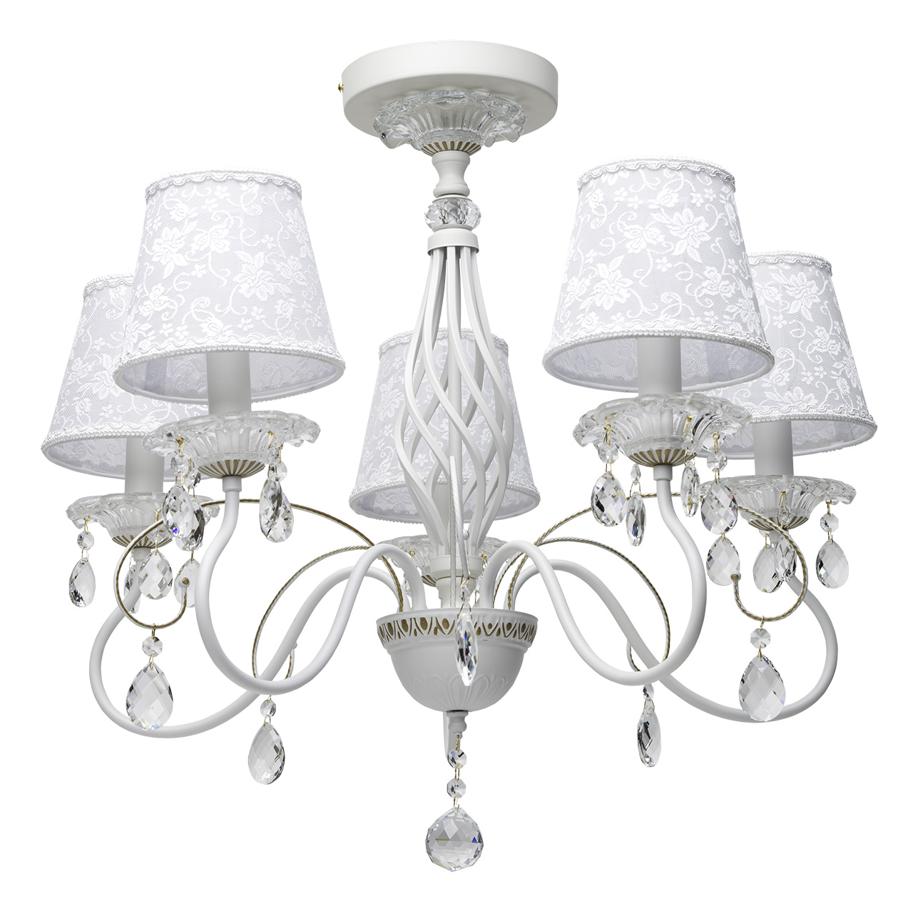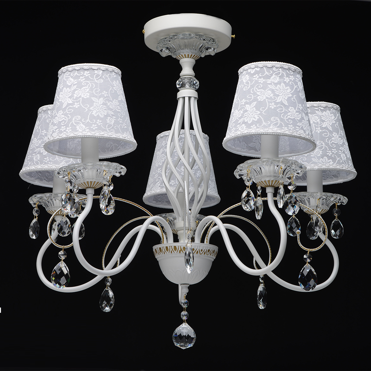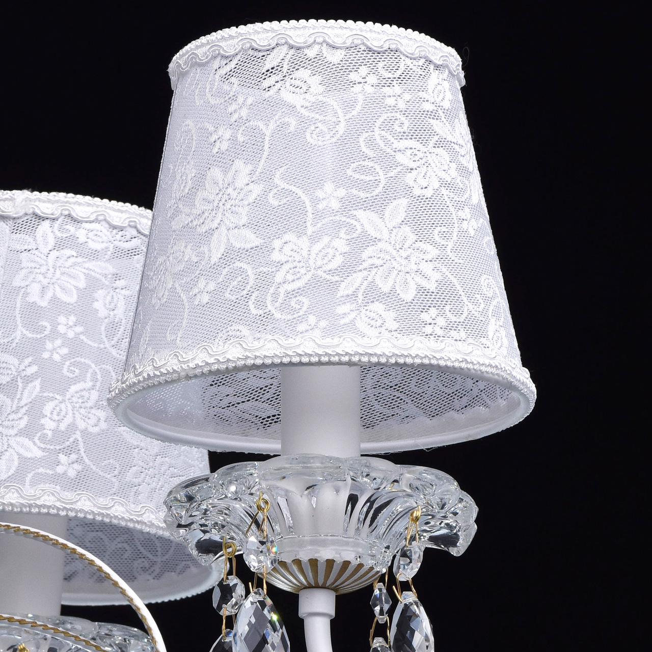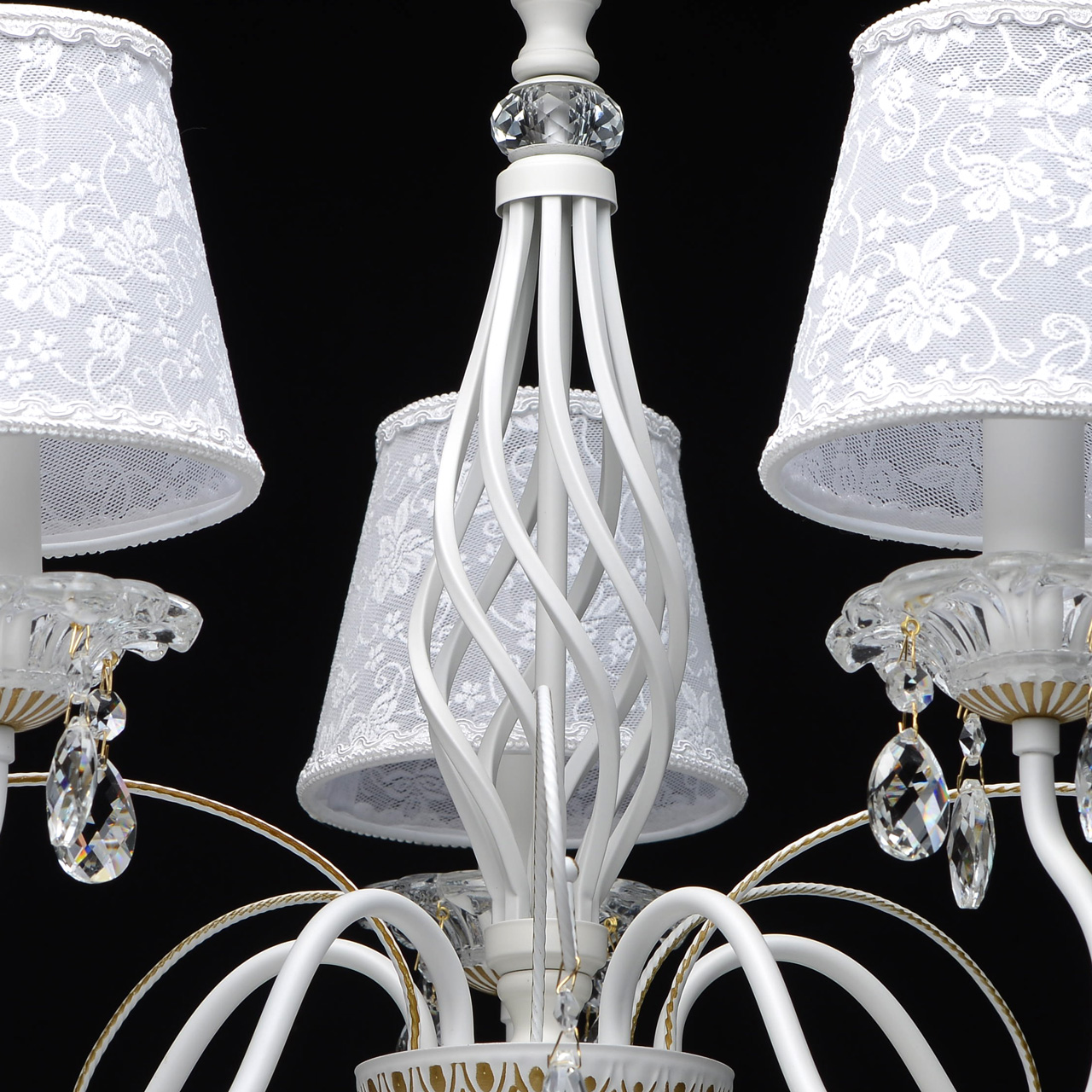 Основание: сплав металла, окрашено в белый цвет, фигурному орнаменту придан объем ручным окрашиванием кистью в цвет золота. Потолочная чаша, корпус: прессование.Центральный стержень: твист.Рожки: прокат на роликовом станке.Светильник декорирован массивом хрусталя сложной огранки, декоративными розетками из стекла, отлитого в форму и подвесками из хрусталя. Абажуры выполнены из кружева с термостойким акрилом внутри и окантованы по краям.