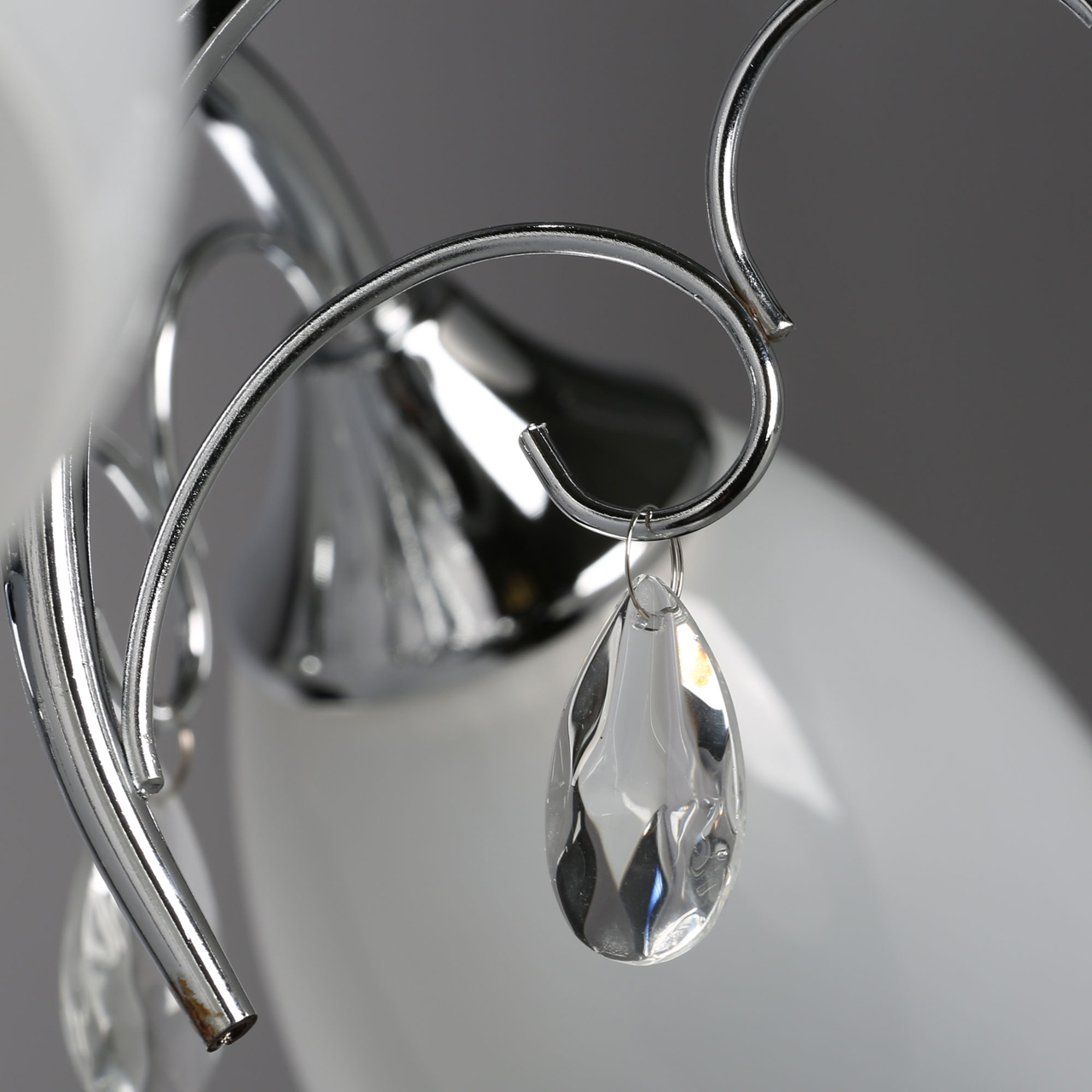 Основание светильника выполнено из металла, гальванизация в цвет хрома. Потолочная чаша, корпус, держатели плафонов изготовлены по технологии токарной обработки, рожки и завитки - прокат на роликовом станке.Светильник декорирован стеклянными плафонами, отлитыми в форму, с последующим матированием внутренней поверхности. Подвески из декоративного стекла в форме миндаля.