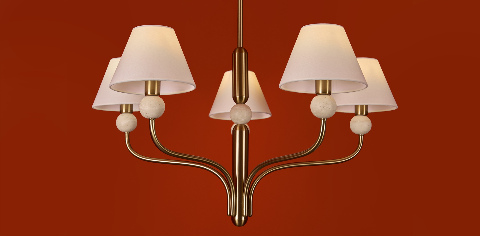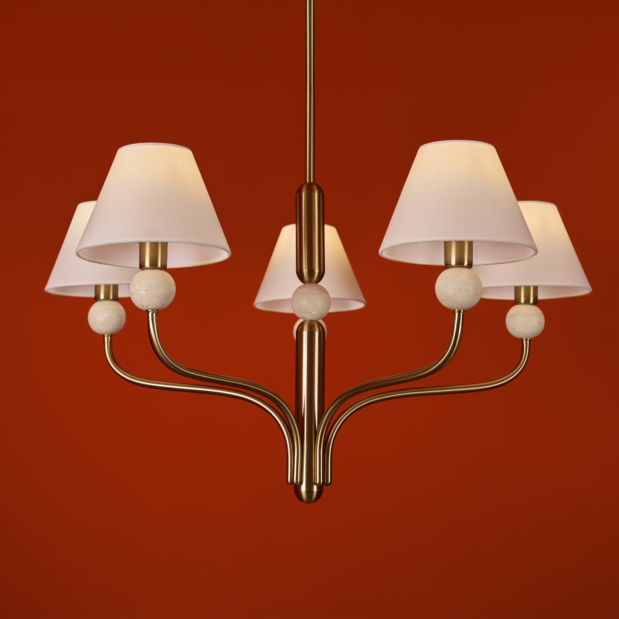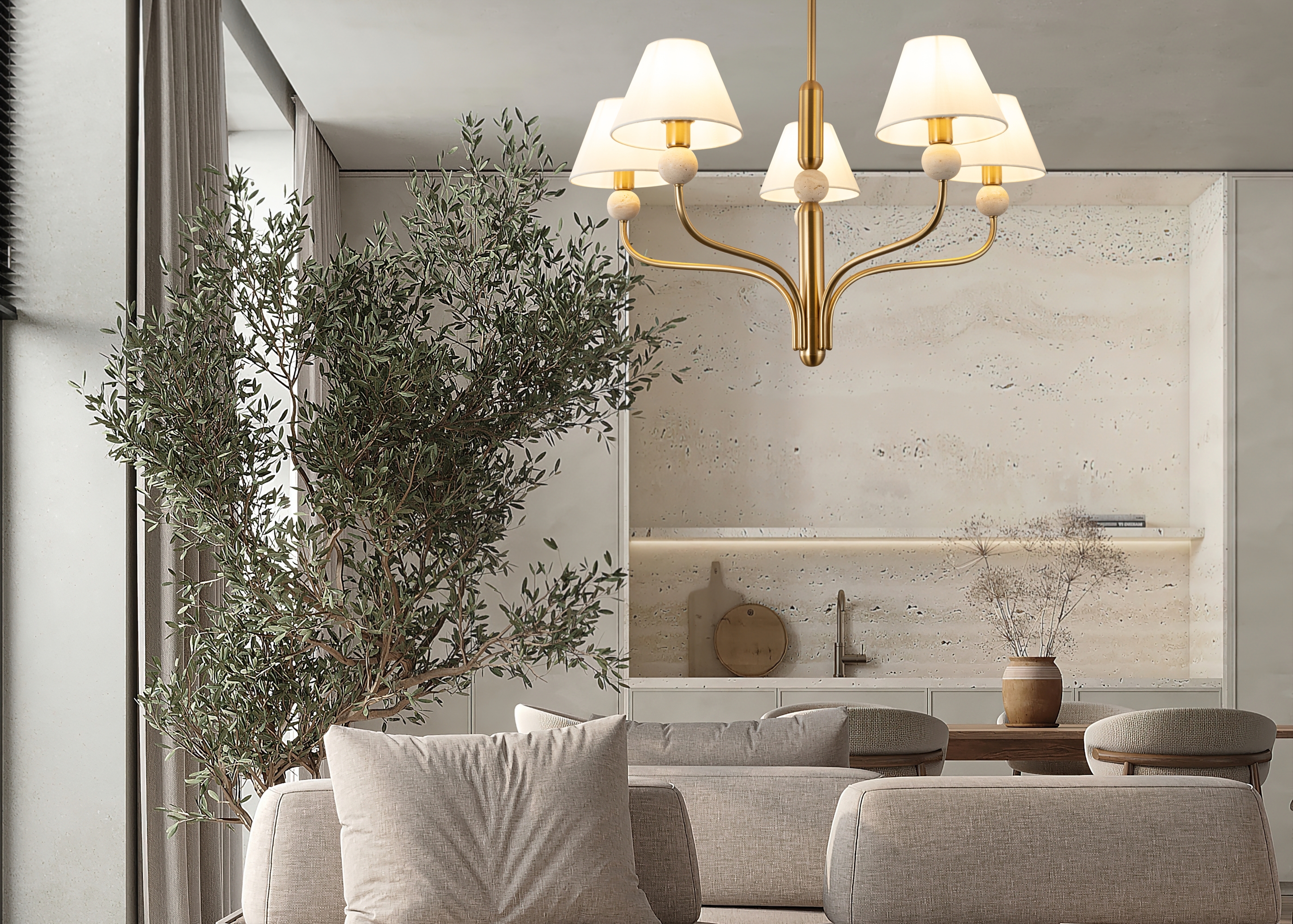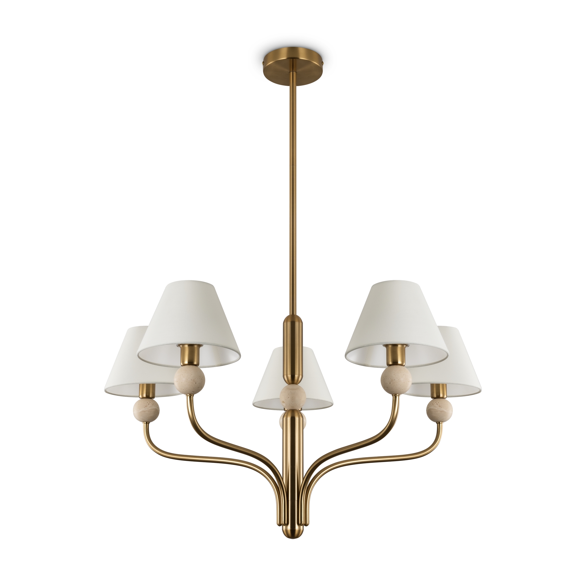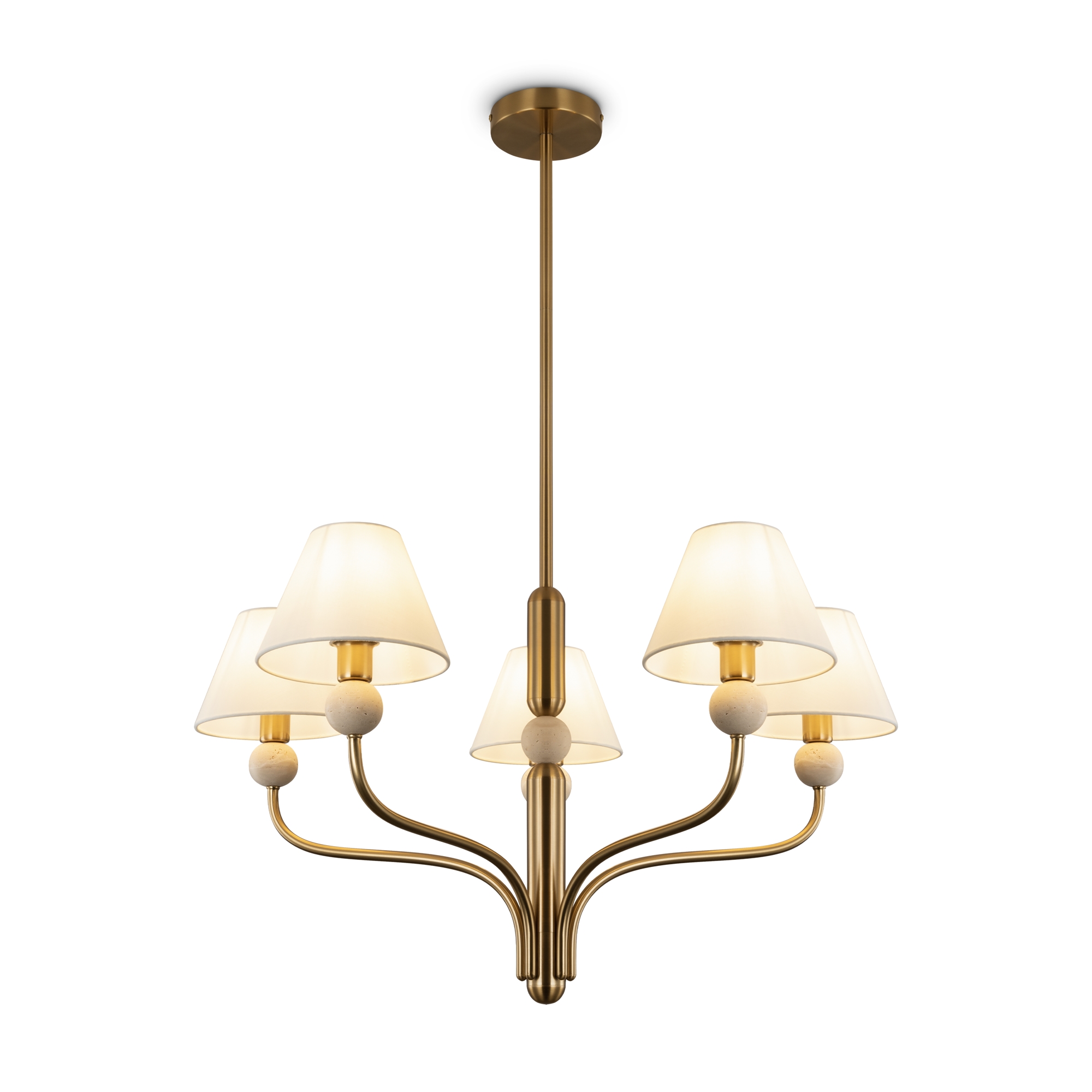 Арматура - металл в цвете латунь. Тканевые абажуры, травертиновые элементы. Лампы E14 (в комплекте). Серия состоит из люстры c 5 плафонами и бра. Трендовое сочетание в классическом стиле.