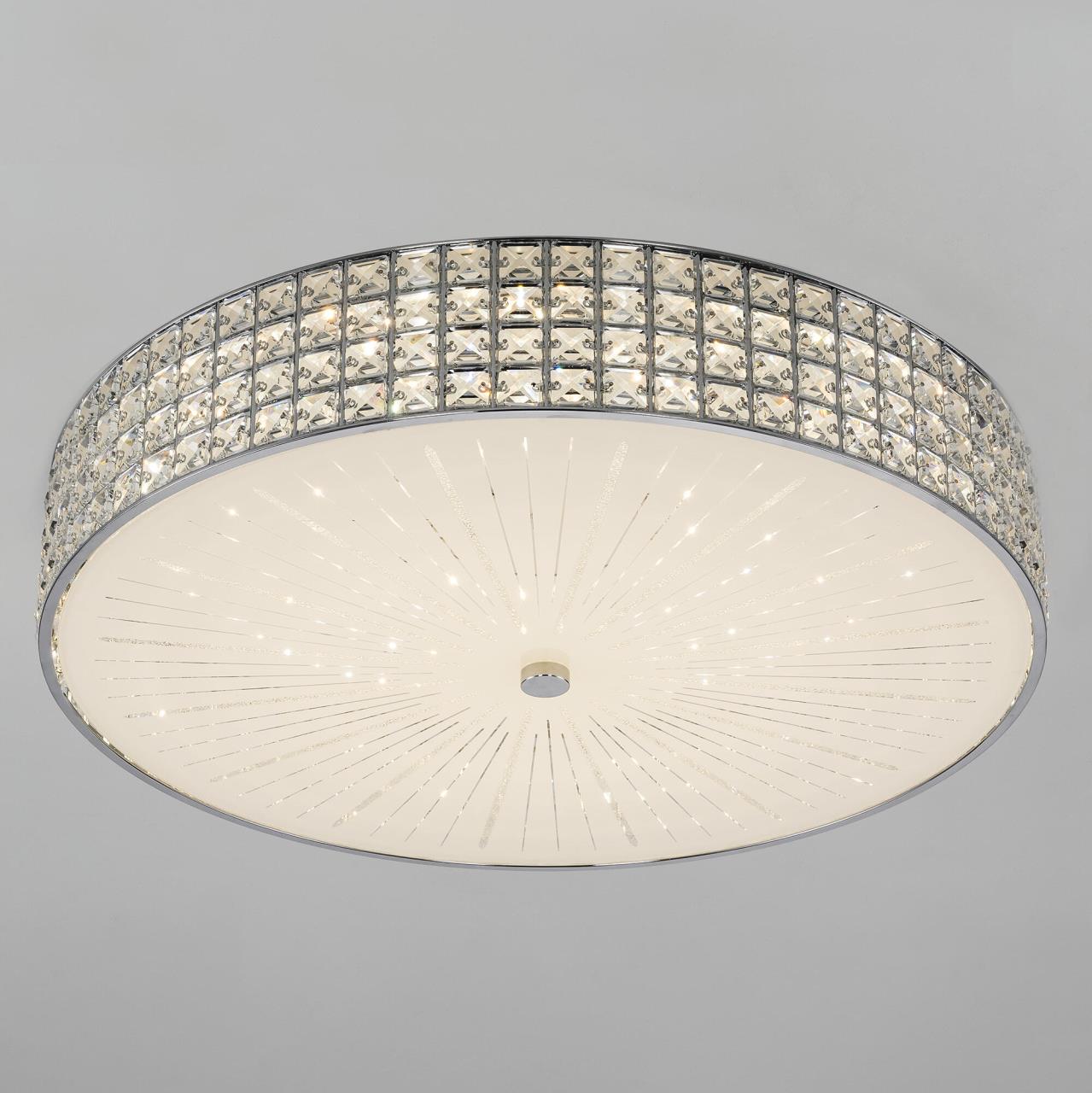Хрустальная потолочная люстра Citilux Портал CL32410G1 выполнена в стиле современной классики. Корпус металлический, цвет глянцевый хром. Боковая часть светильника украшена хрустальными элементами с классической огранкой, в нижней части установлен стеклянный глянцевый рассеиватель с лучистым рисунком.