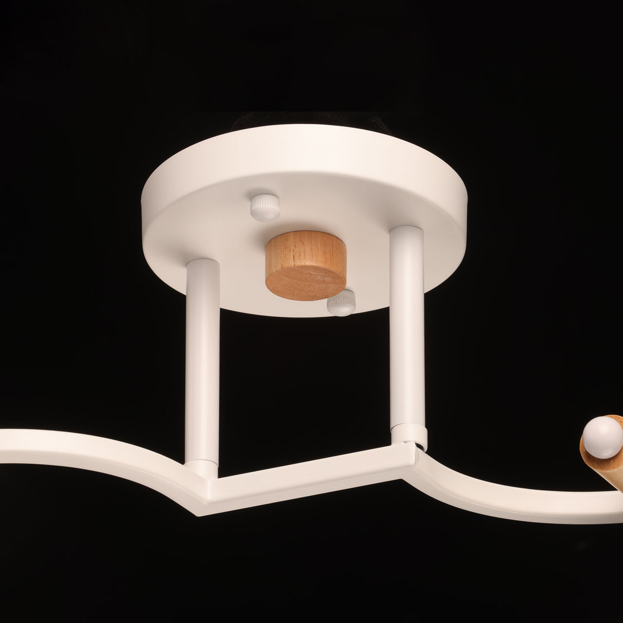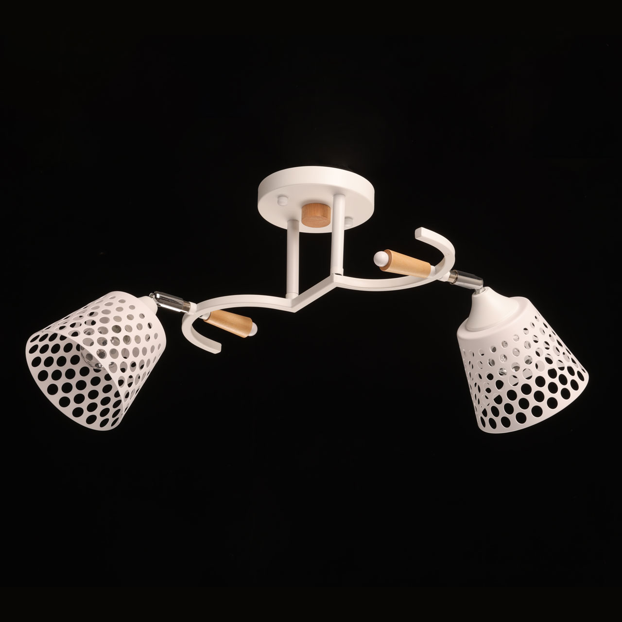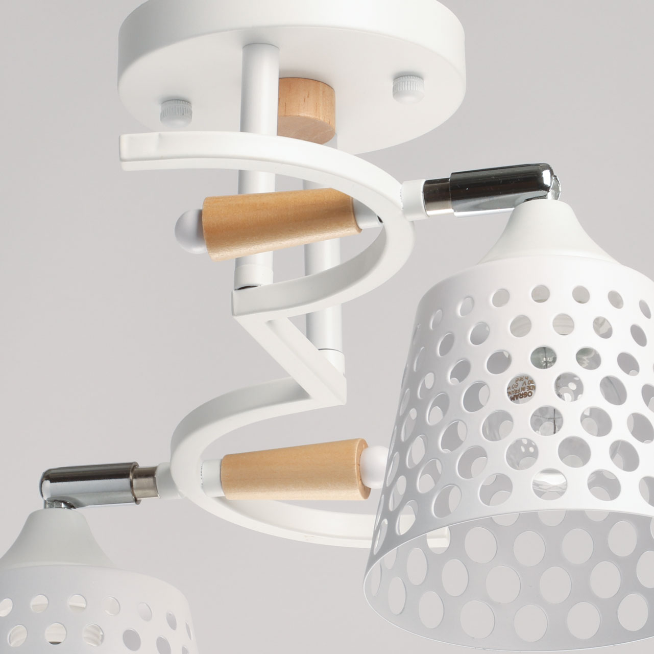 Металлическое основание потолочной люстры окрашено в белый цвет. Отдельные элементы основания гальванизированы в цвет хрома. Металлические плафоны перфорированы и окрашены в цвет основания. Светильник декорирован элементами из светлого натурального дерева.
