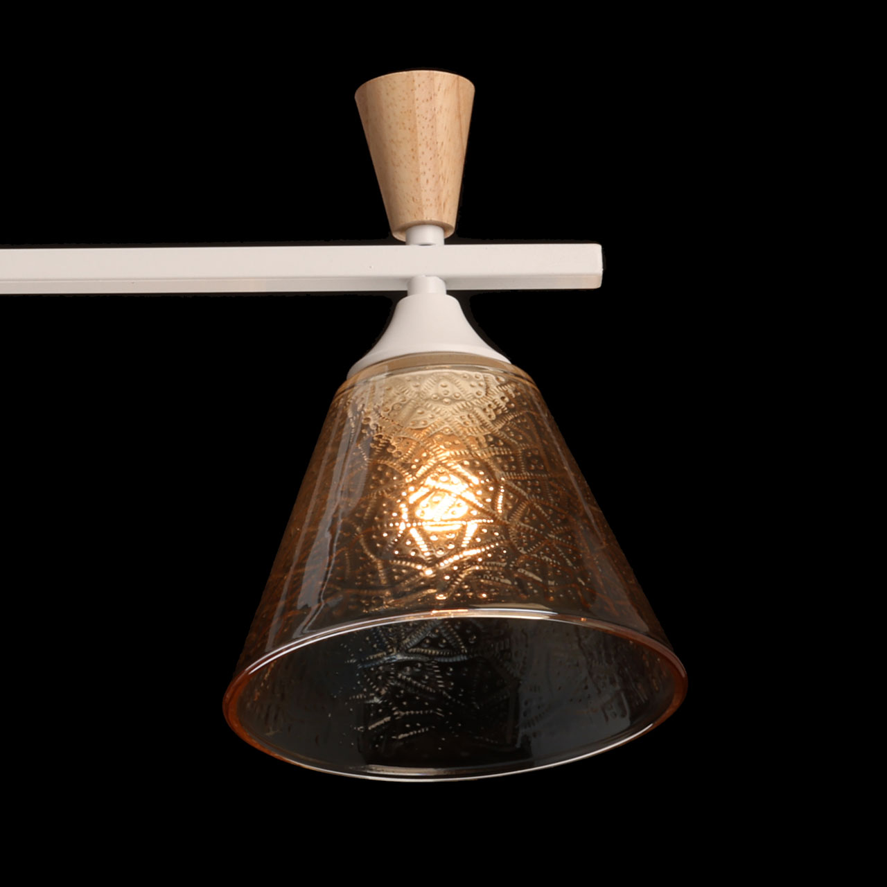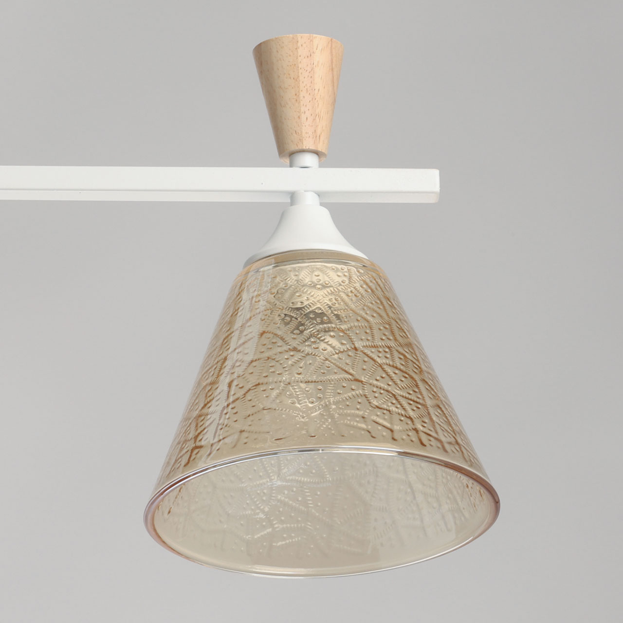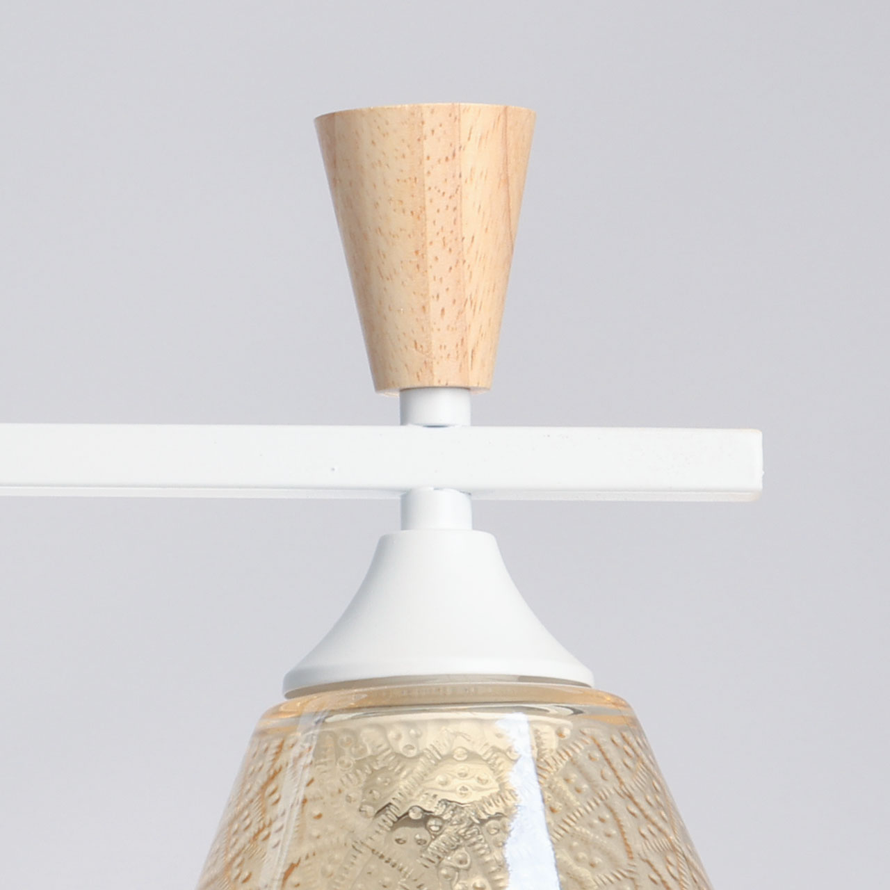 Металлическое основание потолочной люстры окрашено в белый цвет. Стеклянные плафоны отлиты в фактурную форму и гальванизированы в цвет коньяка. Потолочная люстра декорирована элементами из светлого натурального дерева.