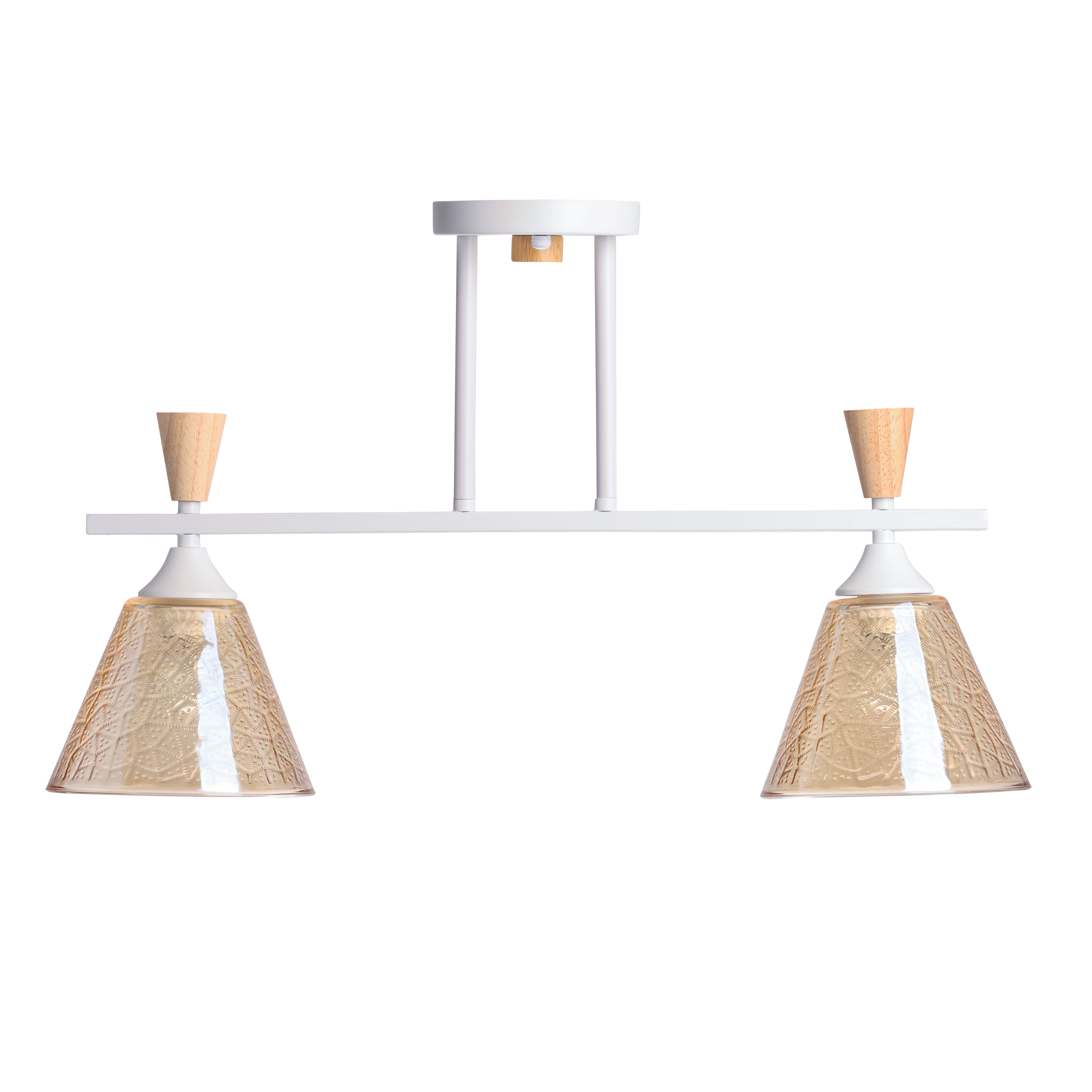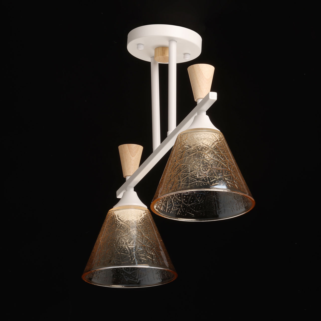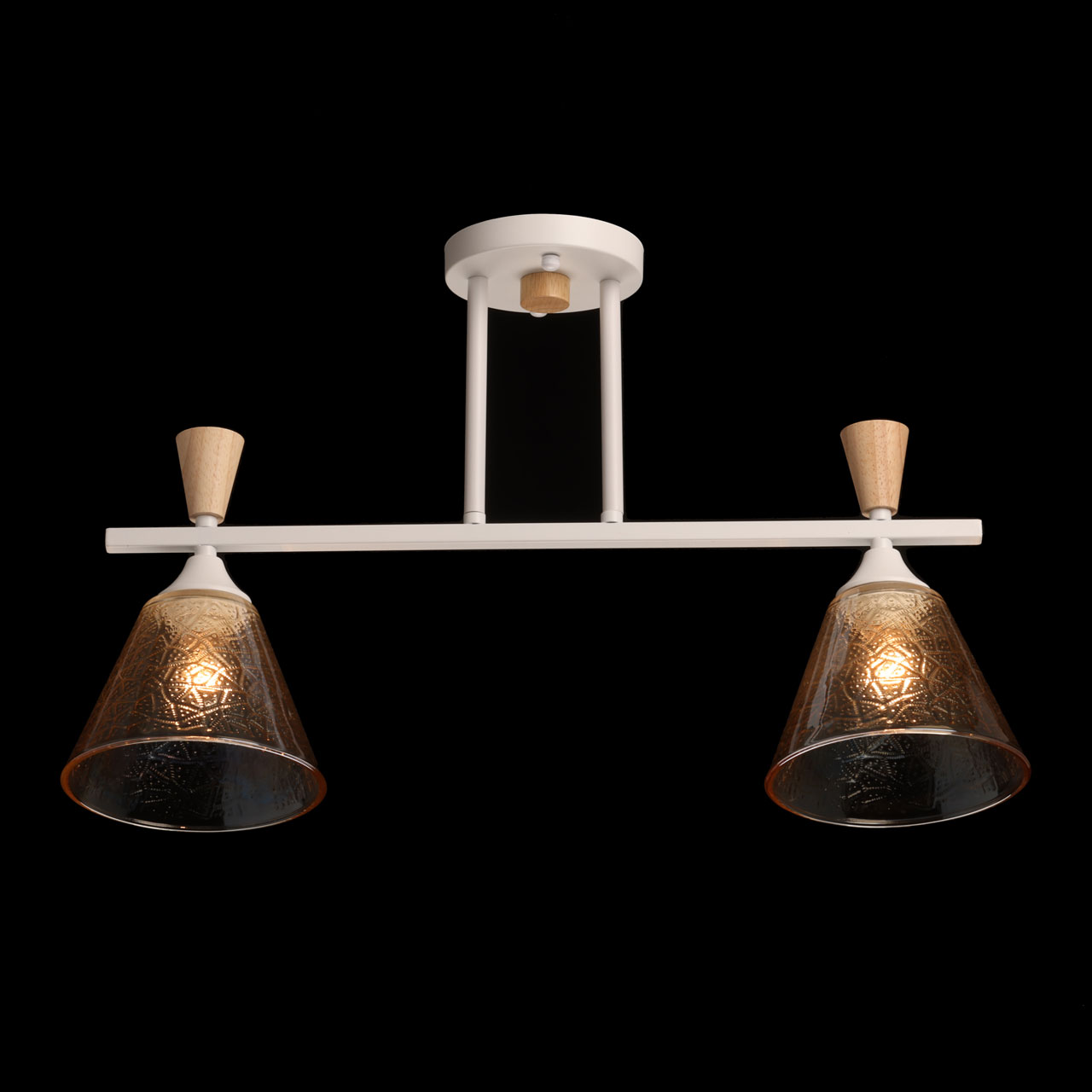 Металлическое основание потолочной люстры окрашено в белый цвет. Стеклянные плафоны отлиты в фактурную форму и гальванизированы в цвет коньяка. Потолочная люстра декорирована элементами из светлого натурального дерева.