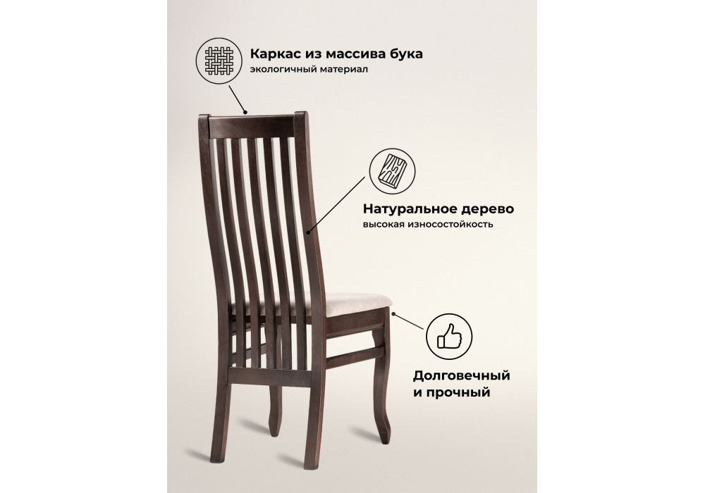 Материал каркаса - массив дерева; Материал сиденья - ткань; Материал обивки - ткань; Ширина - 45; Глубина - 55; Высота - 102; Ширина сиденья - 42; Глубина сиденья - 44; Высота сиденья - 46;