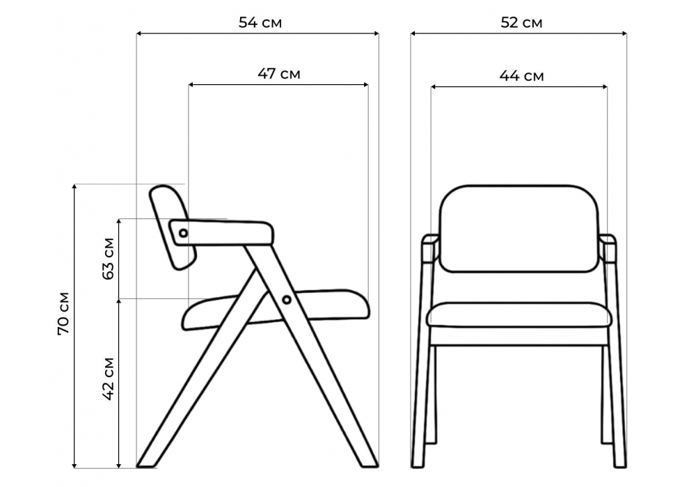 Материал каркаса - дерево; Материал сиденья - ткань; Материал обивки - ткань; Ширина - 52; Глубина - 54; Высота - 70; Ширина сиденья - 44; Глубина сиденья - 47; Высота сиденья - 42;