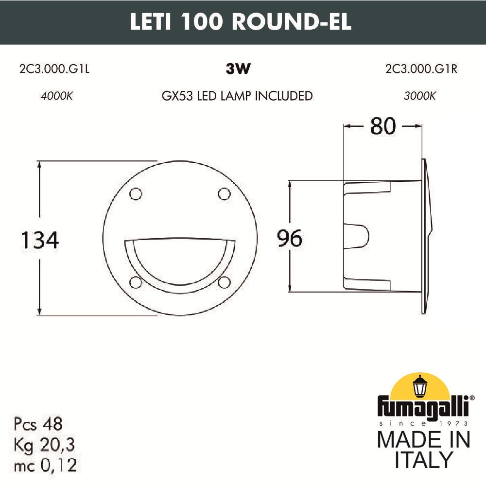 Светильник для подсветки лестниц встраиваемый FUMAGALLI серии LETI, модель LETI 100 Round-GR - изготовлен в Италии. Основное назначение - мягкое, акцентное освещение небольших площадей, световой дизайн, ландшафтная подсветка. Отлично подходит для освещения лестничных маршей, коридоров, подпорных стенок, ландшафтного освещения. Устанавливается в вертикальные поверхности, например в стены, колонны, откосы ступеней. В поверхность монтируется и закрепляется закладной элемент "стакан", в который выводится электрический провод. Далее, в эту деталь устанавливается сам уличный светильник LETI и подключается электропитание. Корпус изготовлен из современного вандалостойкого, негорючего полимера RESIN не требующего окраски. Прочного, окрашенного в массе, не ржавеющего и не выгорающего на солнце. Все светильники пыле-влаго защищены по стандарту IP66. Корпус ландшафтного светильника не проводит электричество, относится к 2 классу электробезопасности. Рассеиватель выполнен из антивандального, не мутнеющего и не горючего PMMA. Срок службы светильника - не менее 20 лет. Не требуется трансформатор. Напряжение питания - 220 В. Температура использования от -60 до +90. При заказе требуется выбрать цвет корпуса.